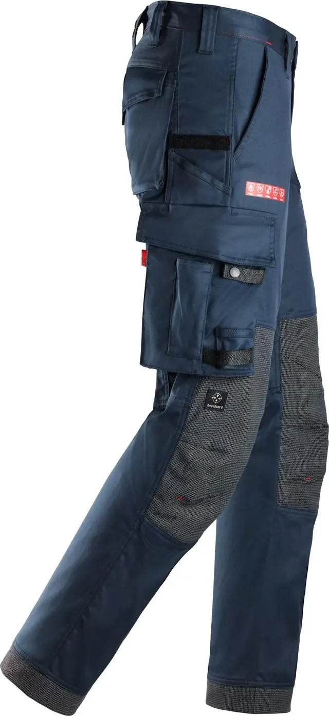 Deze duurzame stretch werkbroek biedt betrouwbare bescherming in gevaarlijke werkomgevingen. De broek beschermt tegen hitte, vuur en elektrische vlambogen. Ook is de broek antistatisch. De broek beschermt daarnaast tegen laswerkzaamheden klasse 1 en lichtere chemicaliën. De broek heeft DuPont™ Kevlar®-versterkte beenzakken waarmee je gemakkelijk je gereedschappen bij de hand houdt. De zak op het linkerbeen heeft een met rits beveiligde zak en een extra compartiment. De zak op het rechterbeen heeft een pennenzak. Beide zakken hebben meshouders. De broek heeft een taps toelopende pasvorm voor een moderne uitstraling.